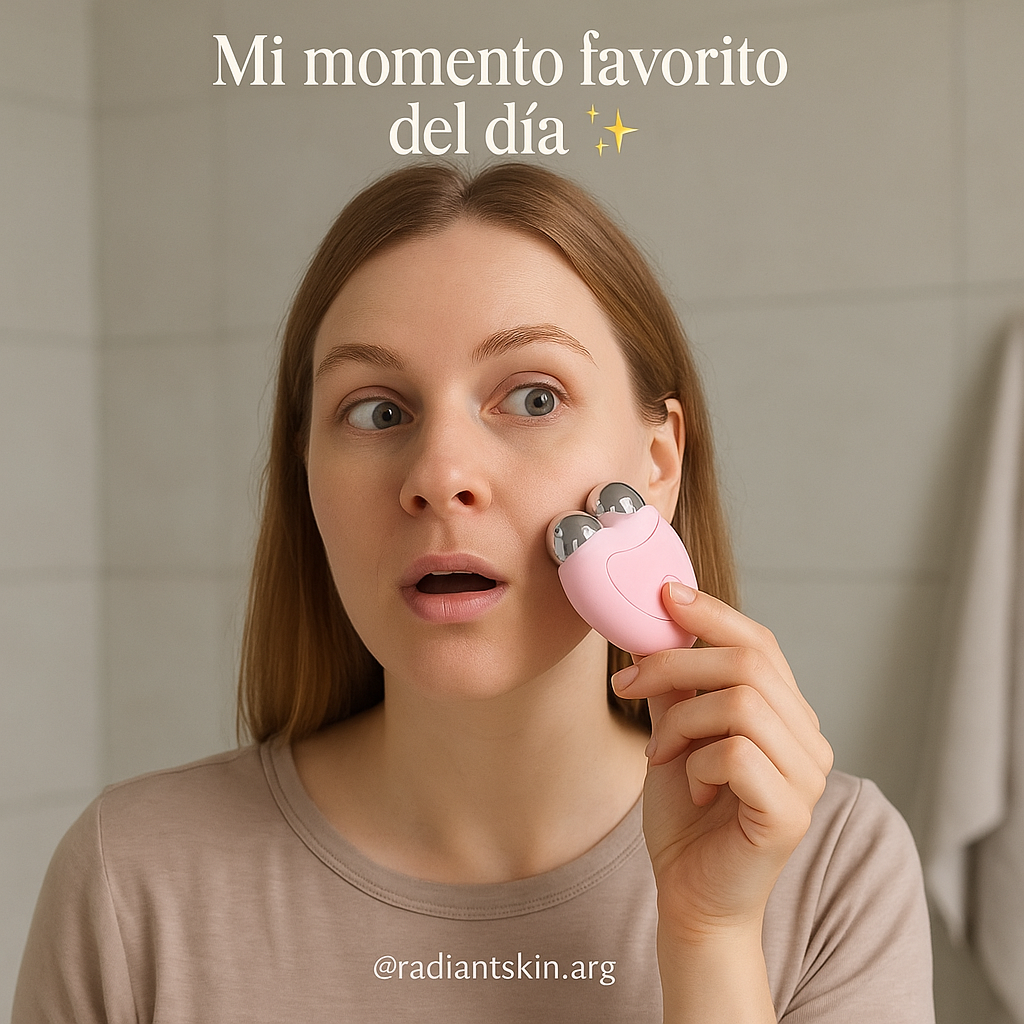 Rodillo EMS: Las microcorrientes (EMS) generan contracciones suaves que "despiertan" los músculos faciales, aumentando la circulación y la producción de colágeno.