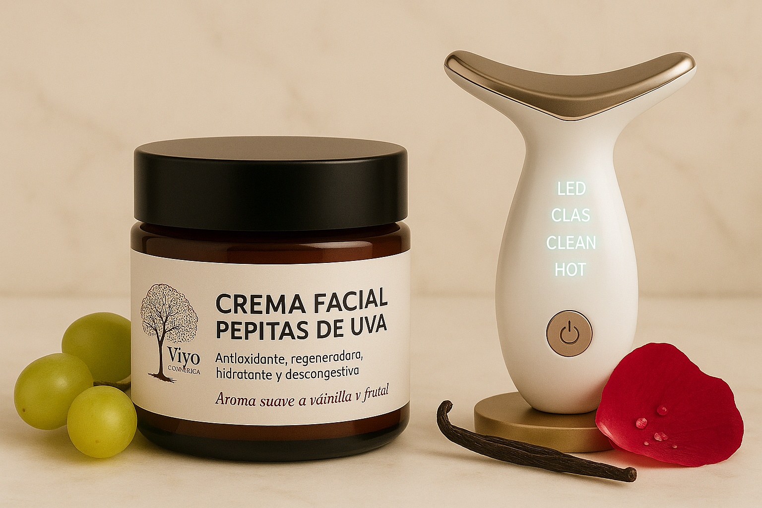 Combiná la Crema con Pepitas de Uva y el Masajeador Sónico 7 en 1 para un tratamiento completo que nutre, reafirma y devuelve la luminosidad a tu piel.